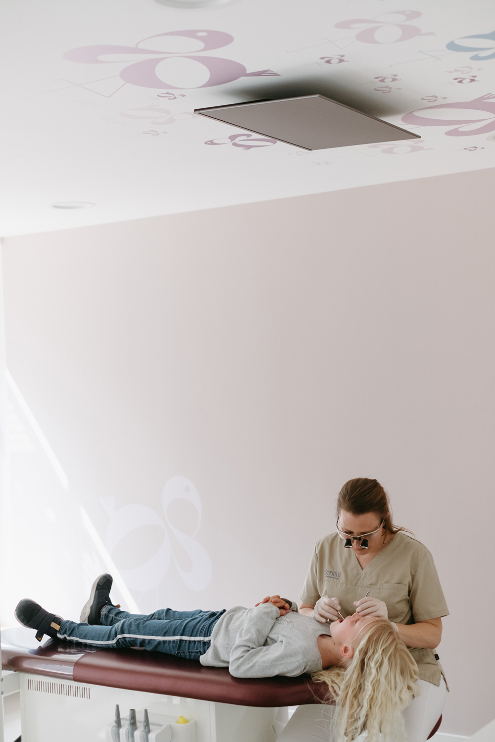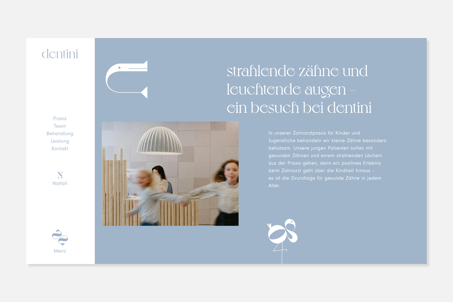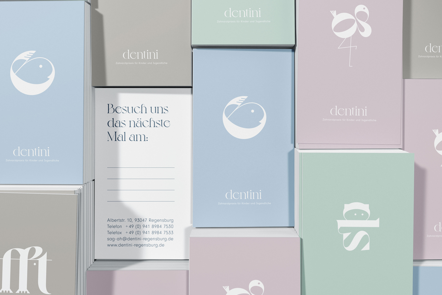 Die Punzen haben Lust und die Serifen haben Laune. Die neue Kinderzahnarztpraxis »dentini« von Vanessa Vogl möchte die Welt aus dem Blick der Kinder sehen. Wir durften den Namen erdenken und die Identität ausgestalten. Mit kindlichem Blick und einem behutsamen Händchen behandelt Vanessa Vogl ihre kleinen Patienten und wir die einzelnen Schriftzeichen aus der Schriftart Voyage so, dass ein Erwachsener Buchstaben sieht und Kinder Tiere entdecken. Unsere Tieroglyphen bieten einem ganzen Alphabet Spielraum und ziehen sich durch das komplette Erscheinungsbild inklusive der Raumgestaltung und schmücken die Decken über den Behandlungsstühlen.