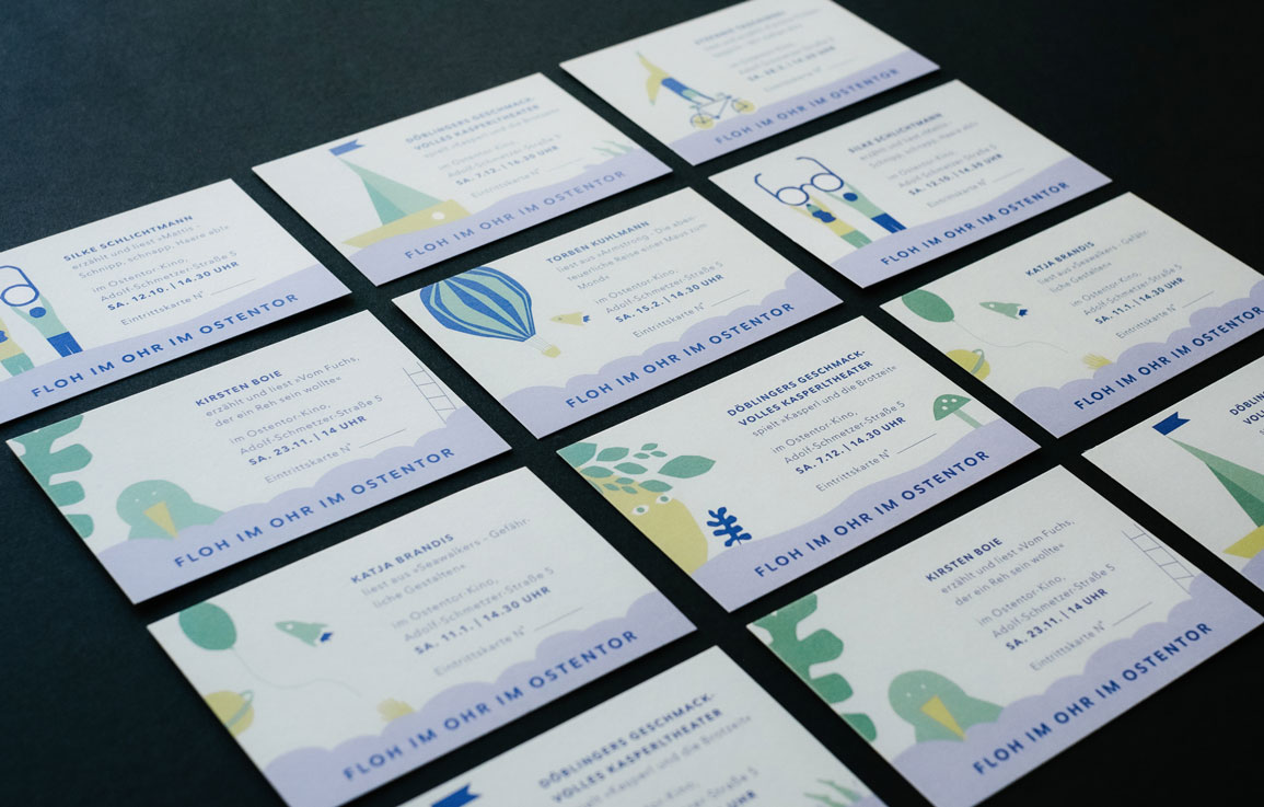 Die Buchhandlung Dombrowsky stellte fest, dass es neben vielen Literaturveranstaltungen für Erwachsene bisher keine Veranstaltung für Kinder gibt. Kurzentschlossen hat Ulrich Dombrowsky im schummrigen Licht des Ostentor-Kinosaals ein neues Veranstaltungsformat etabliert. Die bunte Welt der Kinderbücher, vorgetragen von den Autoren, mit Autogrammstunden und Fragerunden wie bei den "Großen": Floh im Ohr malt Bilder im Kopf und setzt Flöhe ins Ohr. Wir durften wie Kinder rumspinnen, die Fantasie weiter anregen und die Köpfe mit neuen Bildern versorgen: leichte Lesezeichen, feinbunte Programmhefte und ein gepinseltes Logo für Floh im Ohr im Ostentor. Die blassen Töne schlagen leise genug an, um den Träumen Raum zu bieten; sie sind aber auch bunt genug, um Fantastereien zu locken.